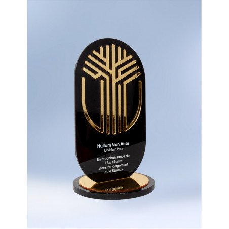 Ce modèle alliant plexi noir et plexi or est un trophée idéal pour valoriser un succès, récompenser un fait marquant dans le milieu professionnel ou particulier...