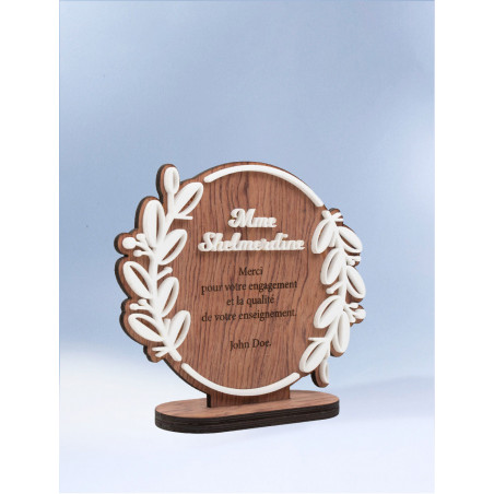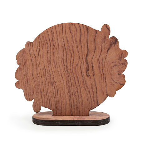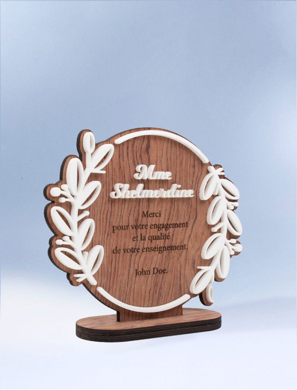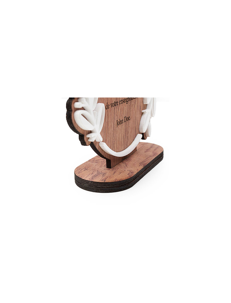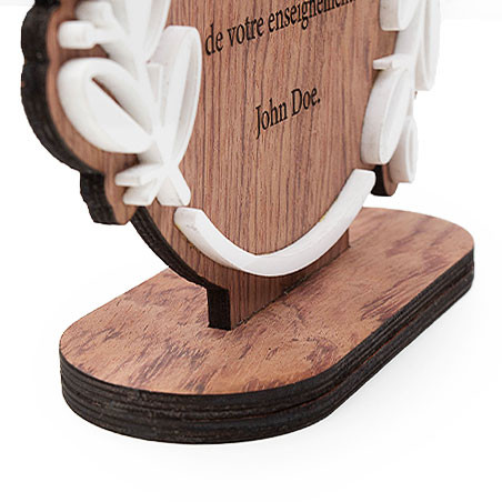 Finition : Découpe laser du plexi miroir monté sur du socle le bois.