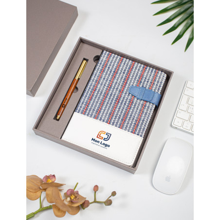 Son carnet à texture tissée et finitions en similicuir s’accorde parfaitement avec le stylo métal imitation bois, pour un ensemble harmonieux et haut de gamme.