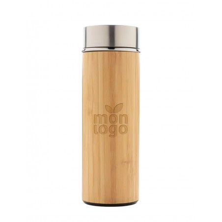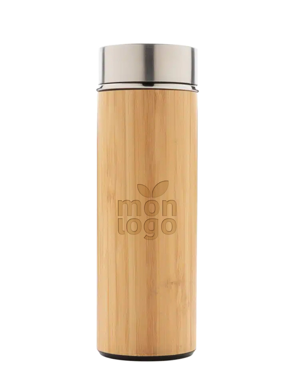 Optez pour l'élégance naturelle et la fonctionnalité optimale avec cette bouteille isotherme qui conserve la température de vos boissons pendant de longues heures. La paroi extérieure est en bambou et l'intérieur en inox.
