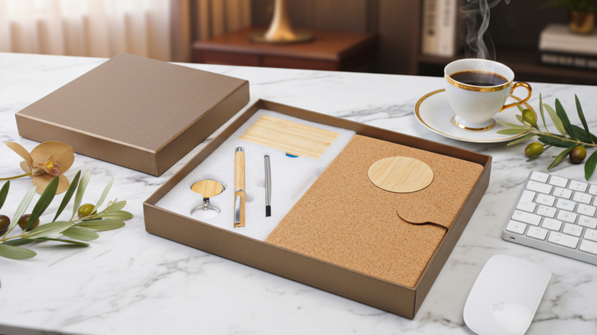 Conçu avec des matériaux naturels, il contient un bloc-notes liège, un stylo en bambou avec mine de rechange, un porte-clés et un porte-cartes assorti — le tout présenté dans un coffret rigide soigné.