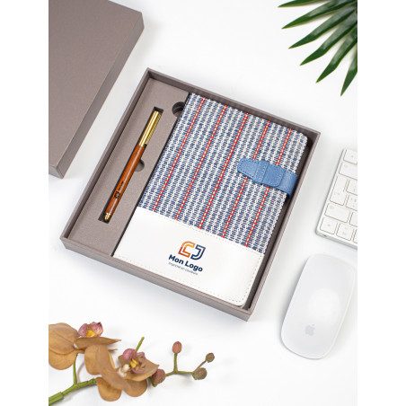 Son carnet à texture tissée et finitions en similicuir s’accorde parfaitement avec le stylo métal imitation bois, pour un ensemble harmonieux et haut de gamme.
