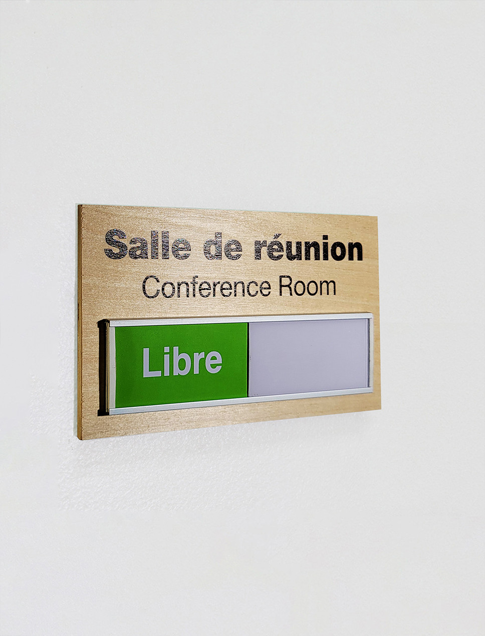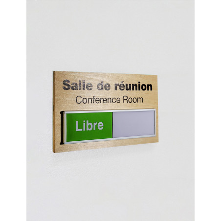 Pour simplifier la gestion des espaces collaboratifs au sein de votre entreprise, nous vous proposons nos plaques coulissantes. Grâce au mécanisme coulissant, elles peuvent comporter des indications claires sur l’occupation, par exemple. Libre à vous d’inscrire les messages que vous souhaitez pouvoir alterner facilement.