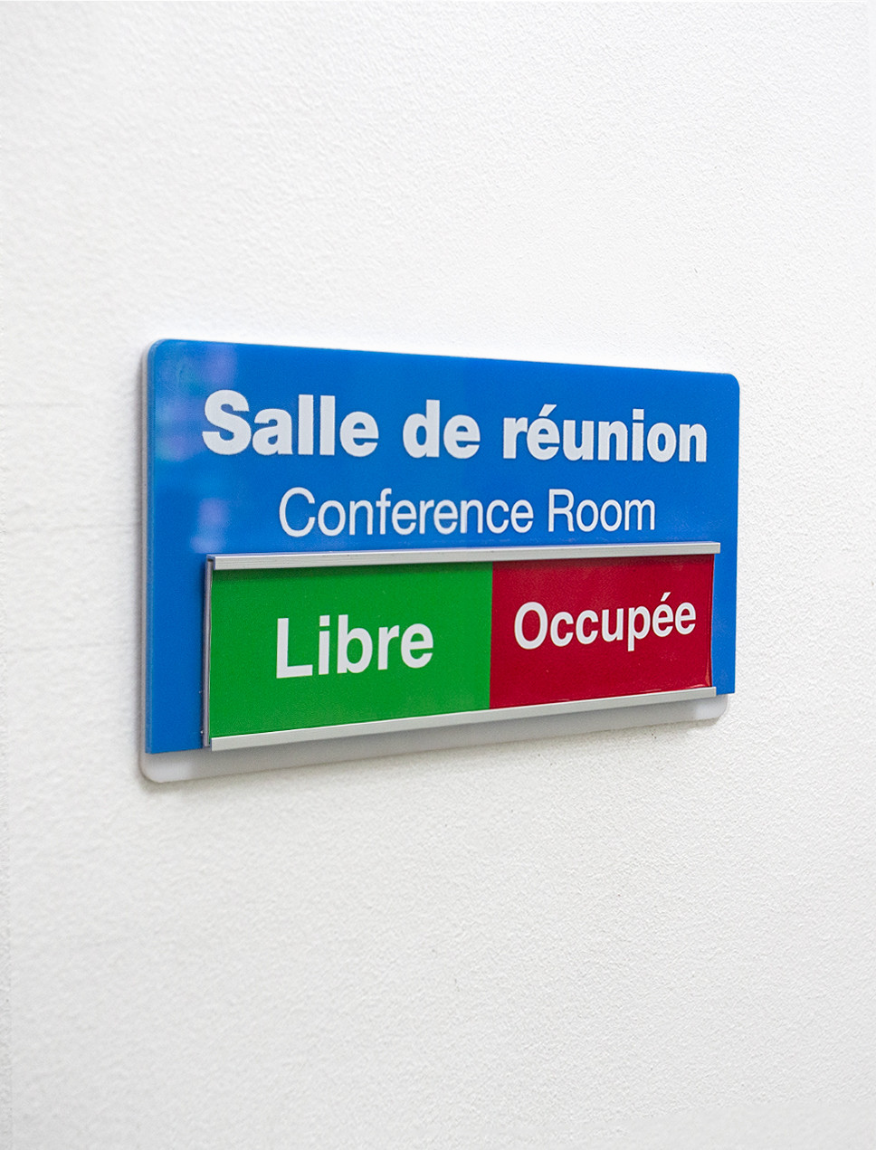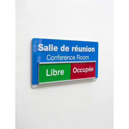 Pour simplifier la gestion des espaces collaboratifs au sein de votre entreprise, nous vous proposons nos plaques coulissantes. Grâce au mécanisme coulissant, elles peuvent comporter des indications claires sur l’occupation, par exemple. Libre à vous d’inscrire les messages que vous souhaitez pouvoir alterner facilement.