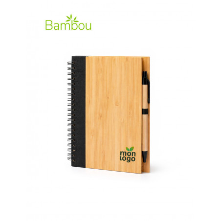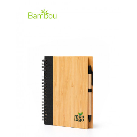 La couverture en bambou, gravée ou imprimée, séduit par son esprit nature. La finition du stylo est un clin d’œil à la bande latéral gauche.