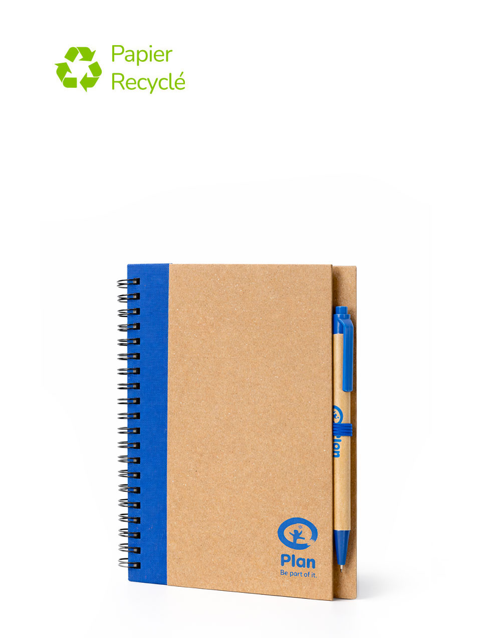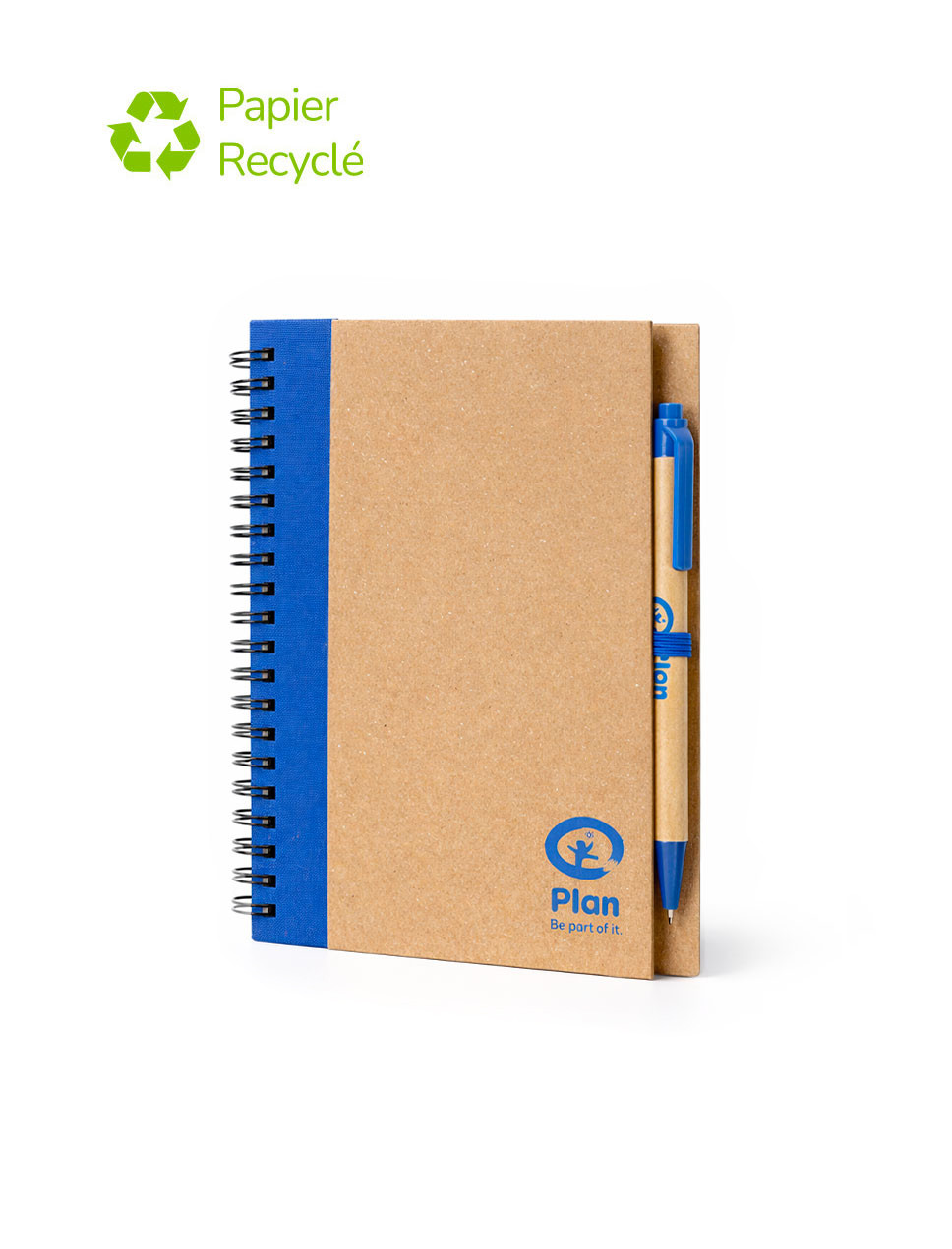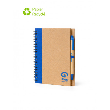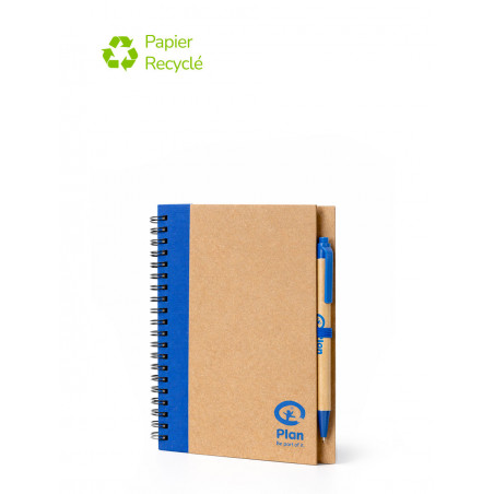 Personnalisable, pratique, ce bloc-note comprend des pages de papier recyclé et un stylo à bille en carton recyclé et en plastique biodégradable aussi personnalisable.